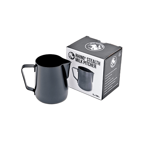 Die Rhino Coffee Gear Stealth Milk Pitchers wurden mit praktischen Eigenschaften ausgestattet, darunter eine hochwertige Antihaftbeschichtung, ein professioneller Ausgießer und ein bequemer Griff.