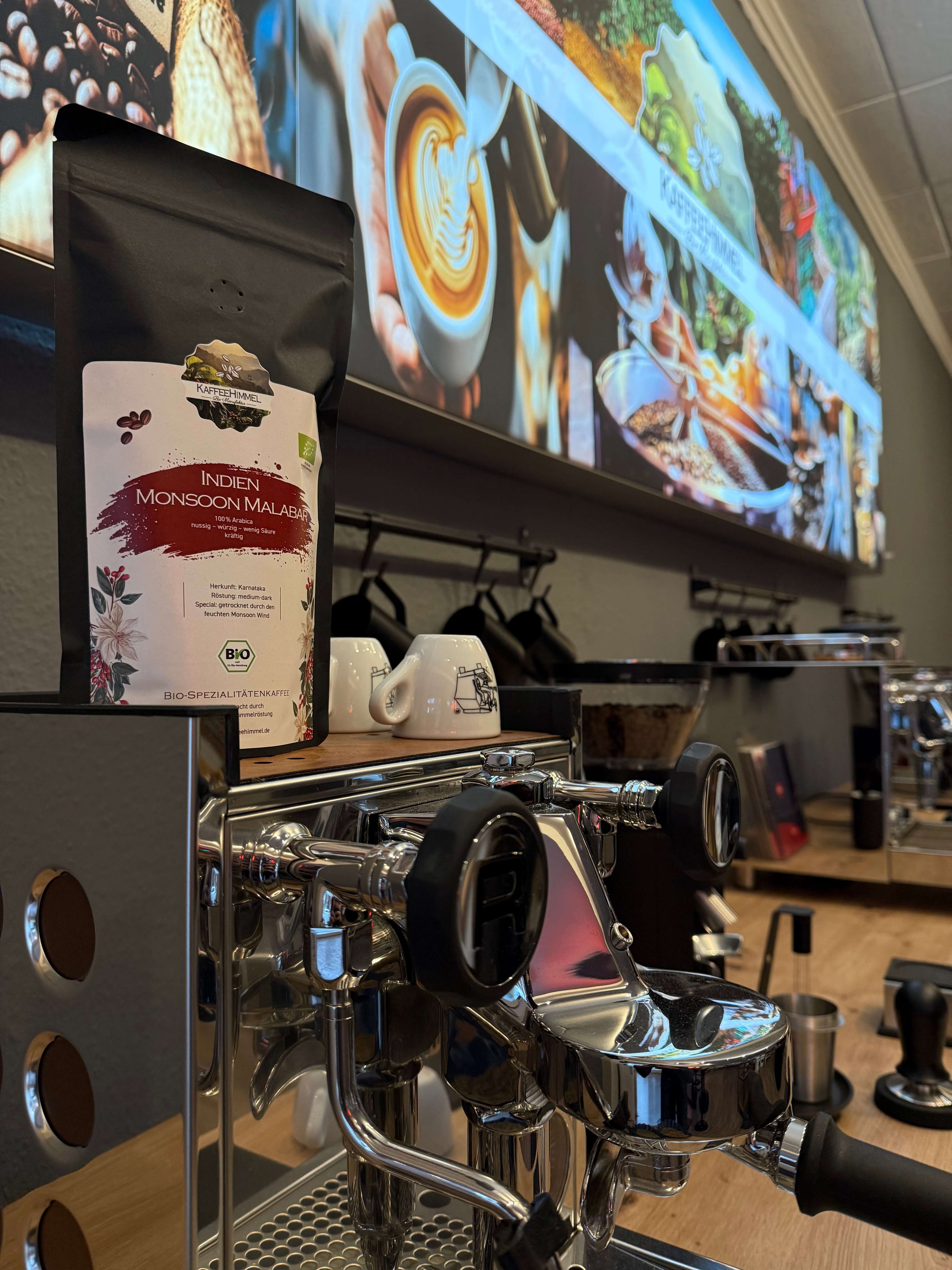 Die von Hand ausgewählten Kaffeekirschen werden während der Monsunzeit in Indien in Trocknungsbetten getrocknet. Durch die feucht-warme Luft entwickeln die Bohne ein unvergleichliches Geschmacksprofil und Aussehen.